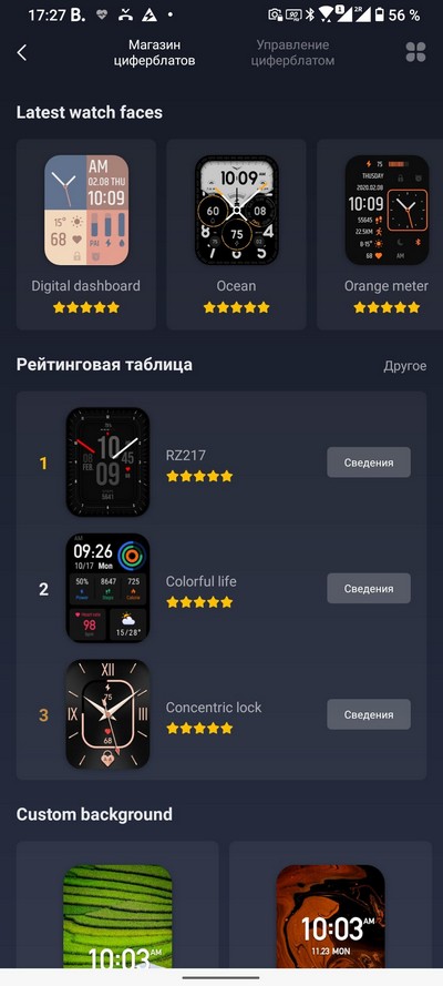 Главный десктоп (циферблат) и режим постоянно включенного экрана. В отличие от GTR 2, где скин постоянно включенного экрана зависит от скина циферблата, здесь только три варианта: классический, цифровой и диски циферблата - вот все три. Но, впрочем, как раз классический зависит от вида циферблата.
