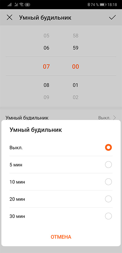 Здесь можно задать до пяти будильников с нужной периодичностью, включая один "умный", причем для "умного" можно задать временной диапазон - это очень удобно. (Это и на часах настраивается.)