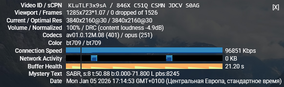 Тот же ролик через европейский сервер hidemy.name. И вот тут уже беда: 4K не идет категорически: постоянно зависает и пытается подгрузить нужный кусок, периодически YouTube сам сбрасывает качество с 4K на 720p - так хоть он более или менее показывается.
