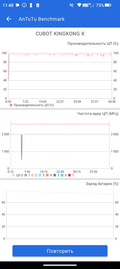 Стресс-тест AnTuTu. Нагрев аккумулятор 40 градусов не превысил.