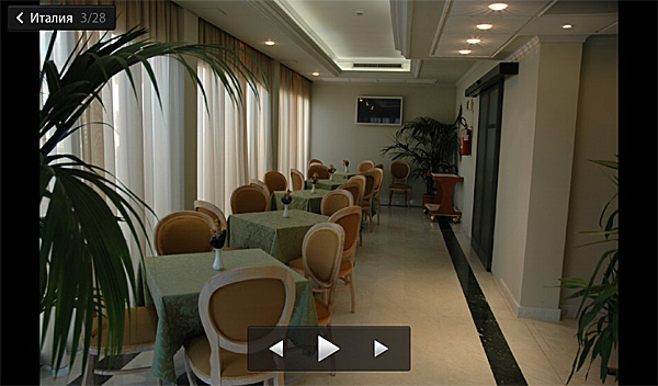 Простенькое приложение, показывающее альбомы, превьюшки картинок, раскрывающее картинки на полный экран. Есть элементарное слайд-шоу - смена картинок, каждая держится две секунды. Не настраивается никак. Так как почтового приложения нет, возможности отправить картинку почтой тоже нет. Убого, короче говоря.