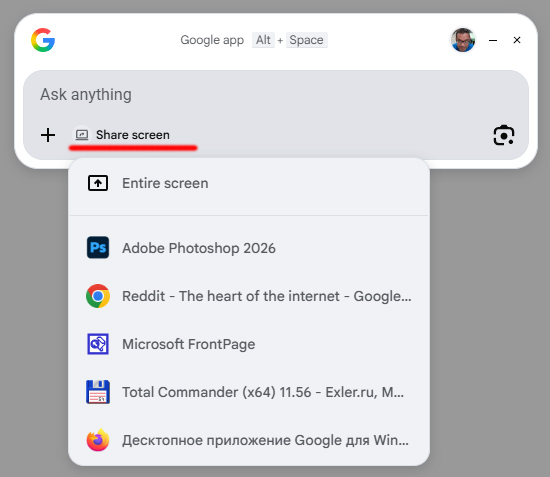 Screen Share - это такой следующий шаг после Lens. Вы делитесь с приложением (а точнее со встроенным туда Gemini) не статичным прямоугольником, а живым окном или всем экраном, и ведёте диалог о происходящем. Gemini видит то же, что и вы, и отвечает в реальном времени