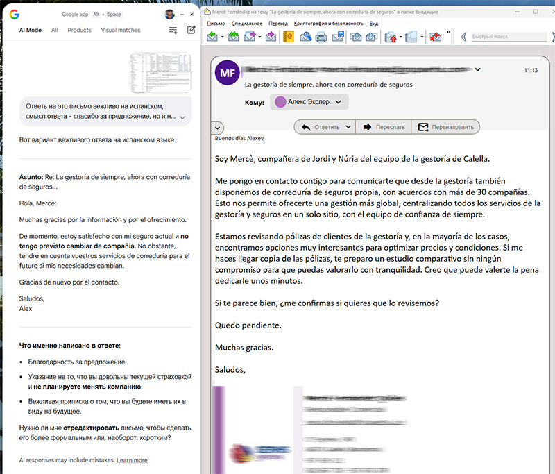 Ну или вот такой чисто практический пример. Пришло мне письмо на испанском с предложением сменить страховую компанию. Я для приложения расшарил письмо (чтобы его текст не копировать) и попросил составить вежливый ответ на испанском о том, что я не планировал менять свою страховую компанию. И сразу же получил то, что нужно.