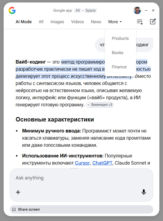 Вот, собственно, и все основные возможности данного приложения. С ним самое, на мой взгляд, главное - это появившаяся возможность использовать Lens с любыми приложениями (до этого данный инструмент можно было использовать только с информацией в открытой вкладке Chrome), а также интерактивная работа с AI Gemini в режиме "Поделиться экраном" - это очень полезная возможность, и она работает очень здорово.