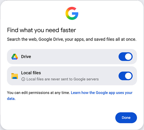 В процессе установки приложение предложит использовать для поиска ваши локальные файлы и содержимое Google Drive.