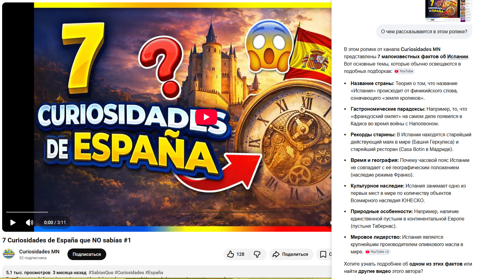 Вот, например, у меня открыт видеоролик на испанском, я расшарил для приложения окно браузера и попросил рассказать, о чем там идет речь.
