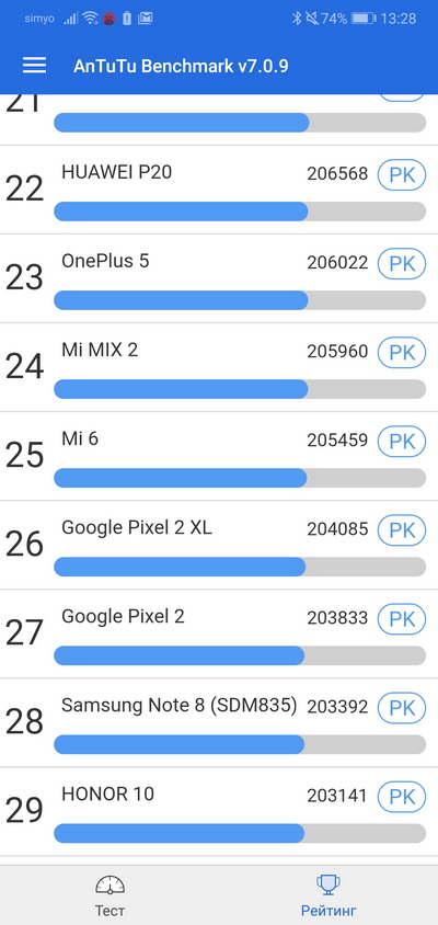 Тест по AnTuTu. Что интересно, P20 Pro он выдал на 10 тысяч попугаев меньше.