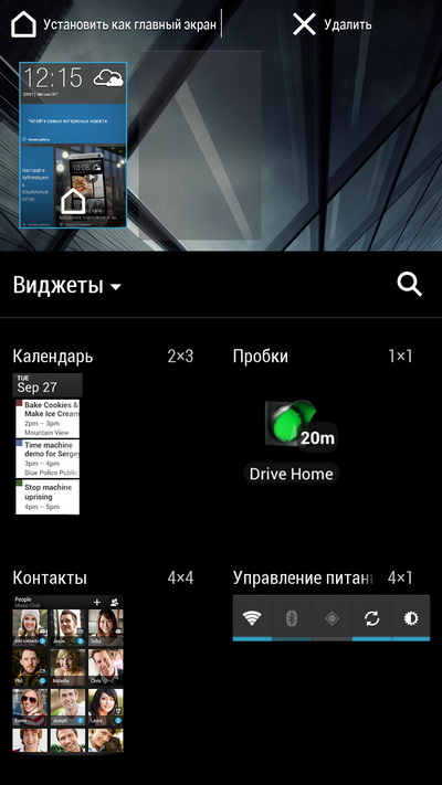 По умолчанию установлены три рабочих стола. На основном, центральном, выставлен виджет времени и погоды плюс хитрый виджет со всякими новостями, советами, информацией из социальных сетей и так далее. Все это пролистывается вниз примерно на десяток экранов и похоже на систему хабов в Windows Phone. В HTC, судя по всему, так гордятся этой разработкой, что удалить этот десктоп вы не можете. Да-да, не можете - и все, он тут будет существовать вечно.