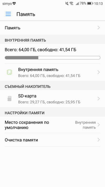 Настройки памяти (по умолчанию можно сохранять программы на SD-карту).