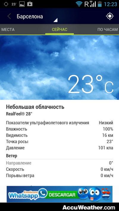 Красивое погодное приложение, которое показывает какую-то полную чушь. Откуда она взяла 23 градуса в Барселоне, когда там 13, не понимаю.