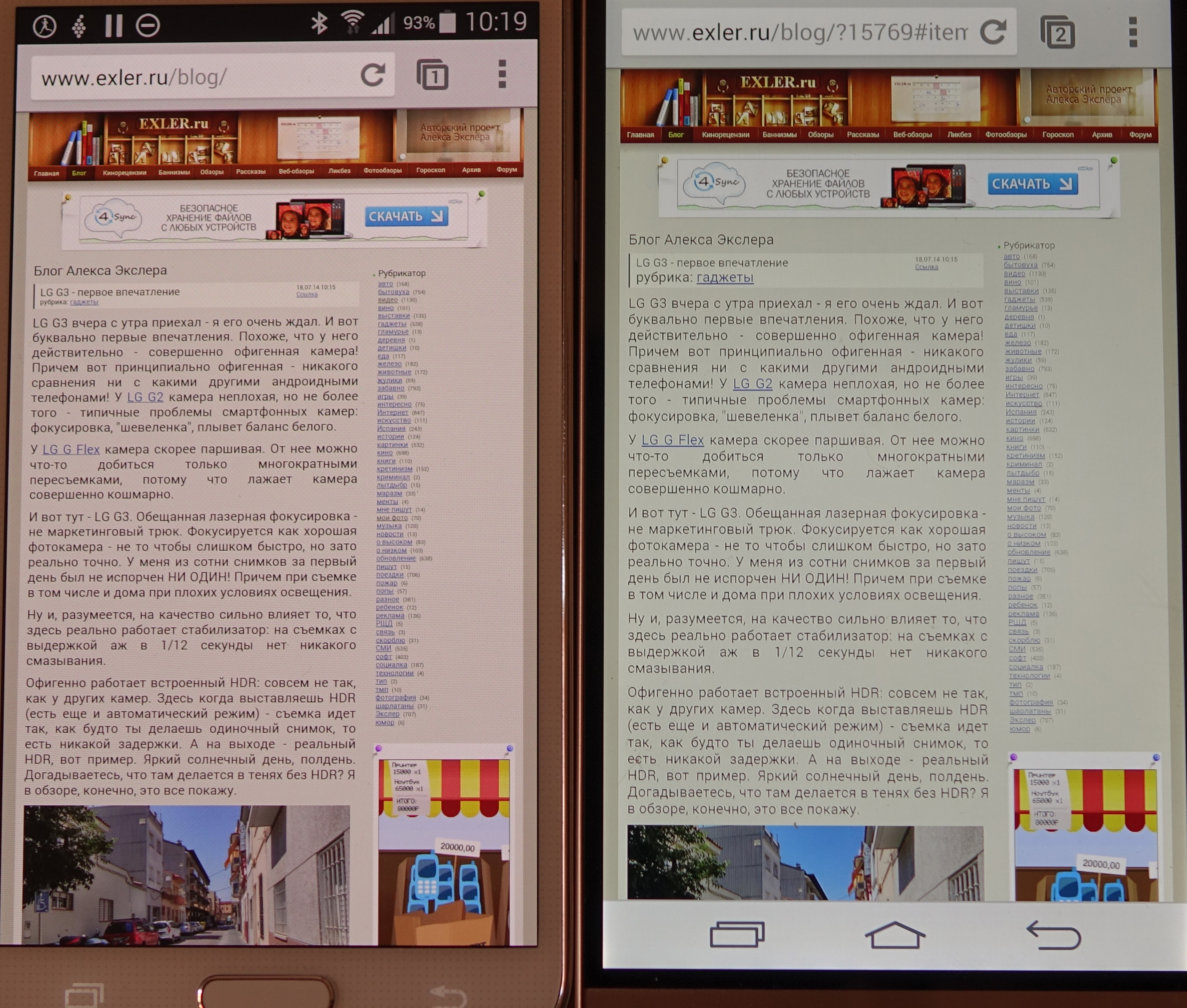 Главный плюс LG в экране. Все лучше, но чтение сайтов без сильного зума серьёзно и значительно лучше. А это очень важно, т.к. это и есть главный неприятный пункт форм–фактора смартфонов. Т.е. ощущение фаблета при вполне телефонных размерах. Ну и ещё, конечно, просмотр фото высокого разрешения (т.е. выше чем у экрана телефона) безусловно доставляет. Похожие ощущения у меня были в Кёльне, на высктавке Фотокина в 2002 году, когда я впервые увидел аналоговые фото-миниатюры, проявленые на плёнке высокого разрешения.