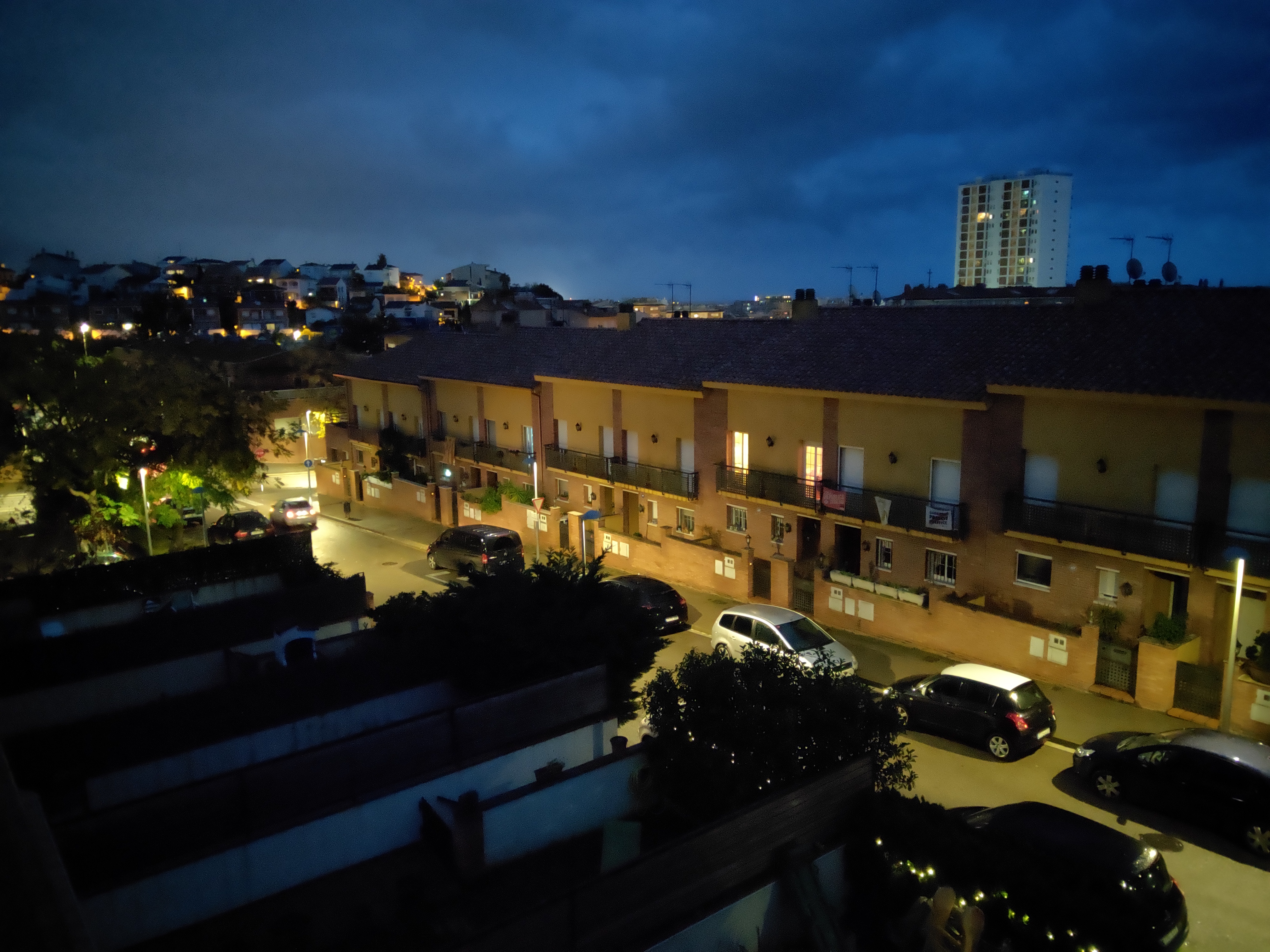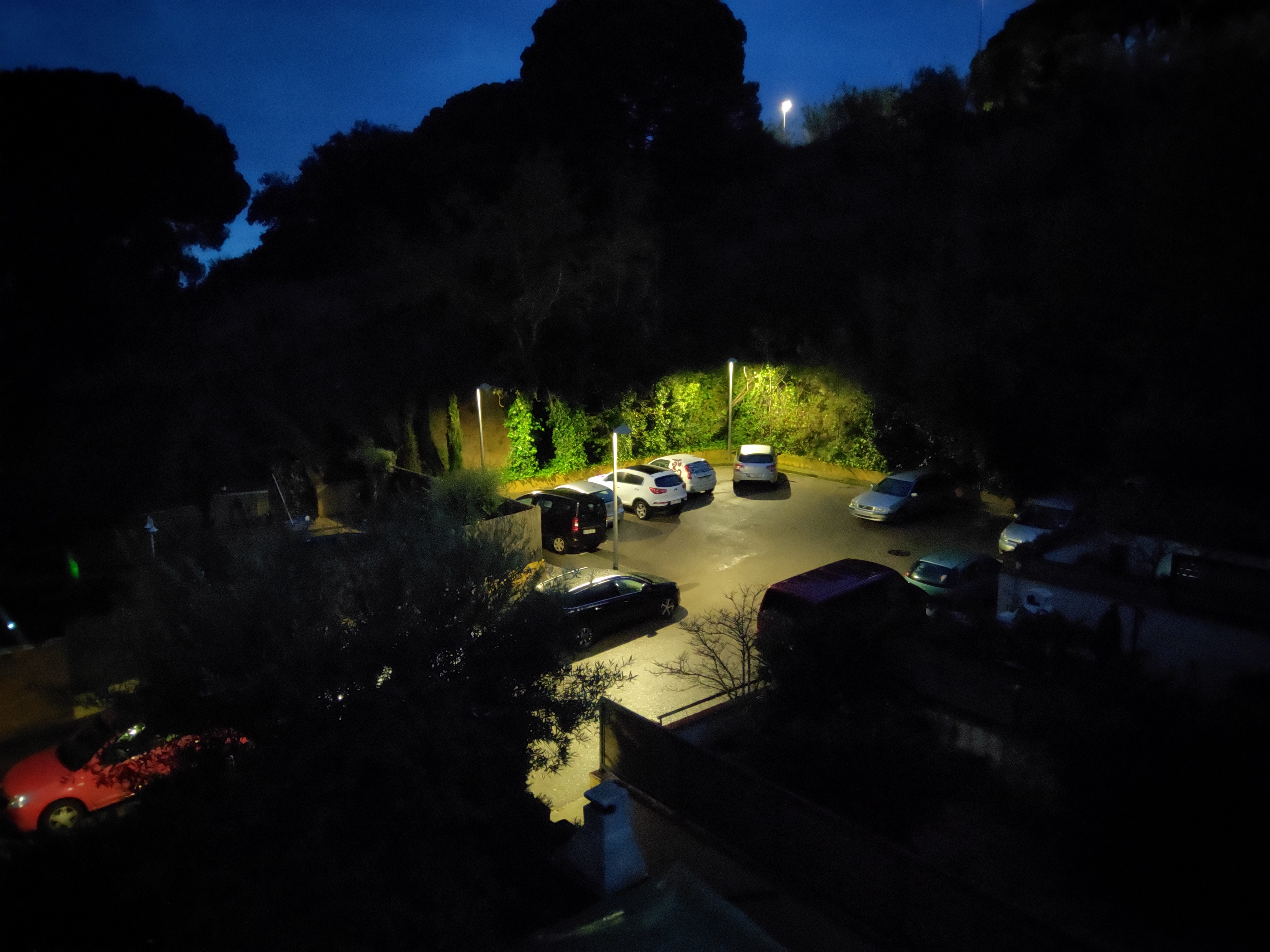 Это вообще почти полная темнота - ночь и без фонарей. Камера зажала ISO на 1600. Шум, конечно, заметный, но шумодав не мылит - уже хорошо.