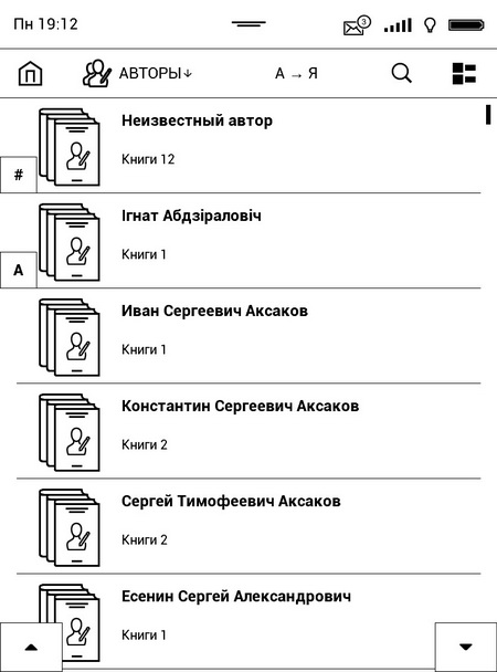 Входим в библиотеку. Там можно выбрать вид отображения книг и документов (плитка, списки), вид сортировки и отбор: все книги, по авторам, по жанрам и так далее.