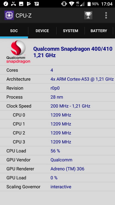 Процессор: Qualcomm Snapdragon 410, 4-ядерный,