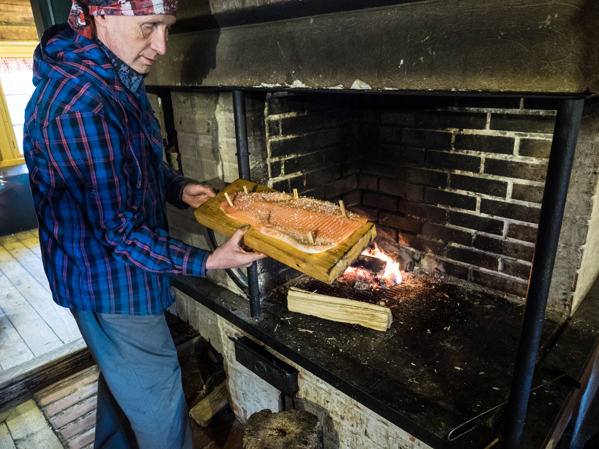 В очаге по старой финской традиции готовился лосось. Делают его очень просто: берется филе лосося со шкуркой, пришпиливается деревянными клинышками к доске, посыпается крупной солью.