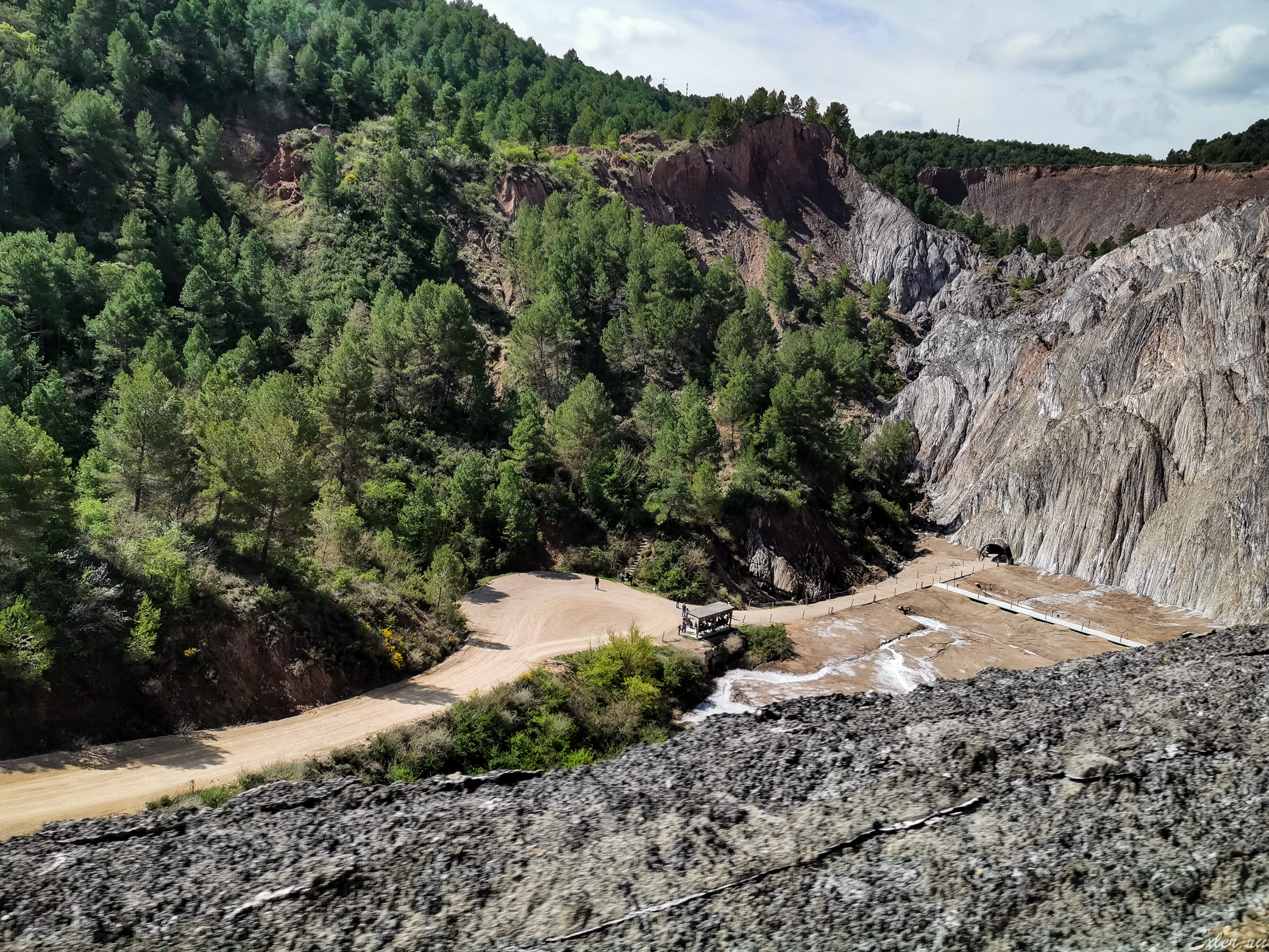 Вид на месторождение сверху. По дороге в центре небольшие автобусы везут туристов. Их высаживают на остановке, которая видна справа сверху там, где заканчивается дорога, после чего группы ведут в Соляную гору, вход в которую находится где-то в пятидесяти метрах от остановки.