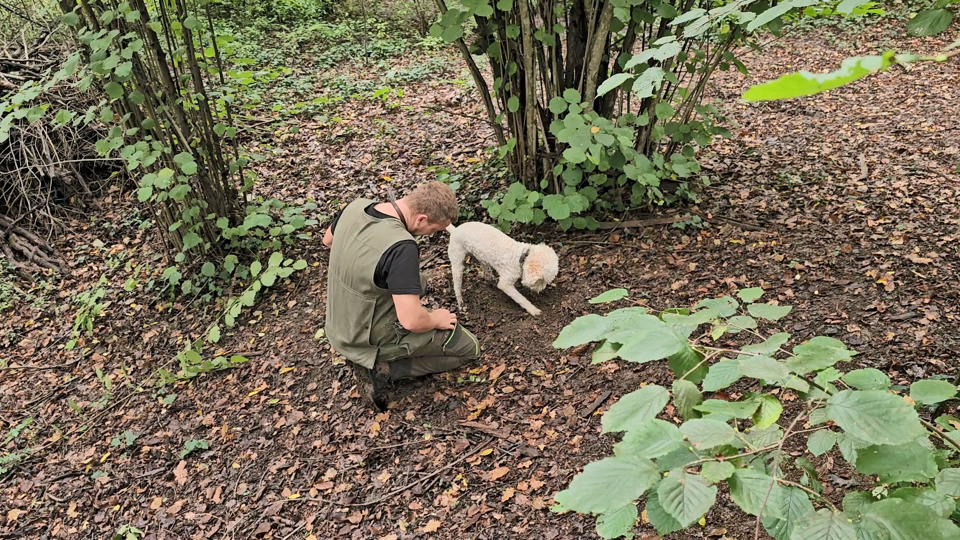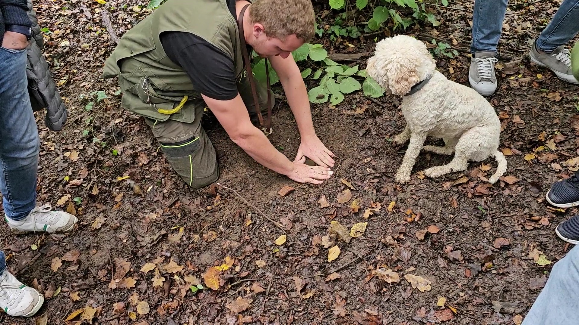 Пришли в лес. Даниэле спустил Бьянку с поводка, та стала бегать по лесу и искать трюфели. Как только она что-то нашла, то начала в этом месте рыть землю.