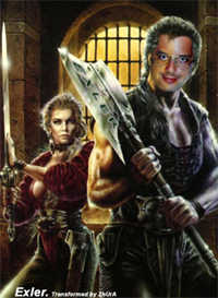 Но роман - это еще что! Лично мне больше всего понравилась галерея участников романа, которую создал человек, называющий себя ZhUrA. Даже если не хотите читать роман, загляните в галерею участников и насладитесь тем, как ZhUrA умеет вклеивать простые человеческие лица в иллюстрации к фэнтэзийным романам. По-моему, просто супер. Профессиональный дизайнер, который вместе со мной разглядывал эту галерею, со мной в этом вопросе согласился. Лично я не являюсь участником романа (мне бы свою народную повесть исхитриться начать...), но иллюстраций, назвав эту прелесть "Боевой Экслер, вырубающий безграмотных" (вы ее видите справа в уменьшенном виде).