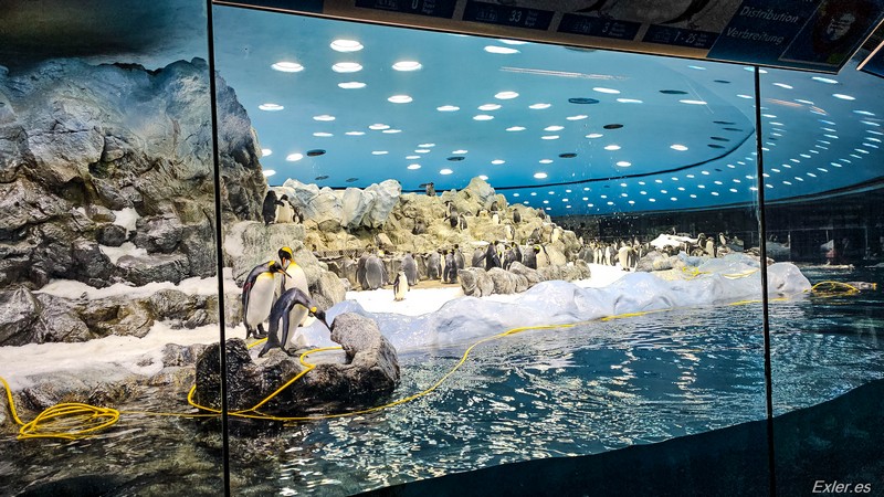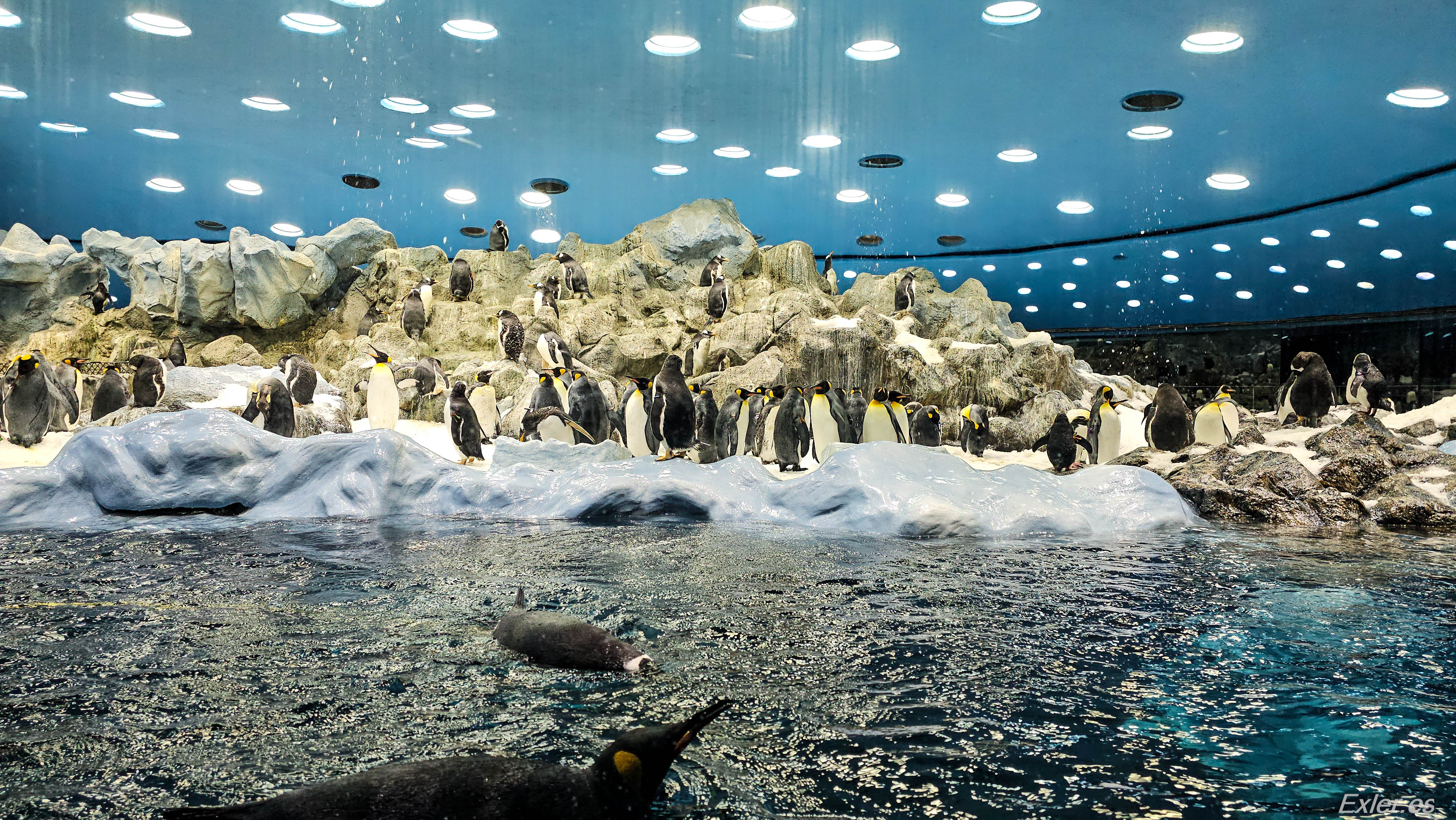А это уже уголок пингвинов. Большая территория с бассейном и снегом (с помощью снеговых пушек пингвинам периодически устраивают настоящие метели).