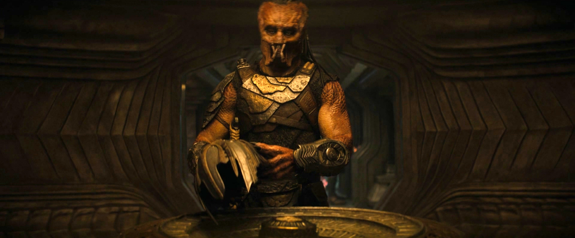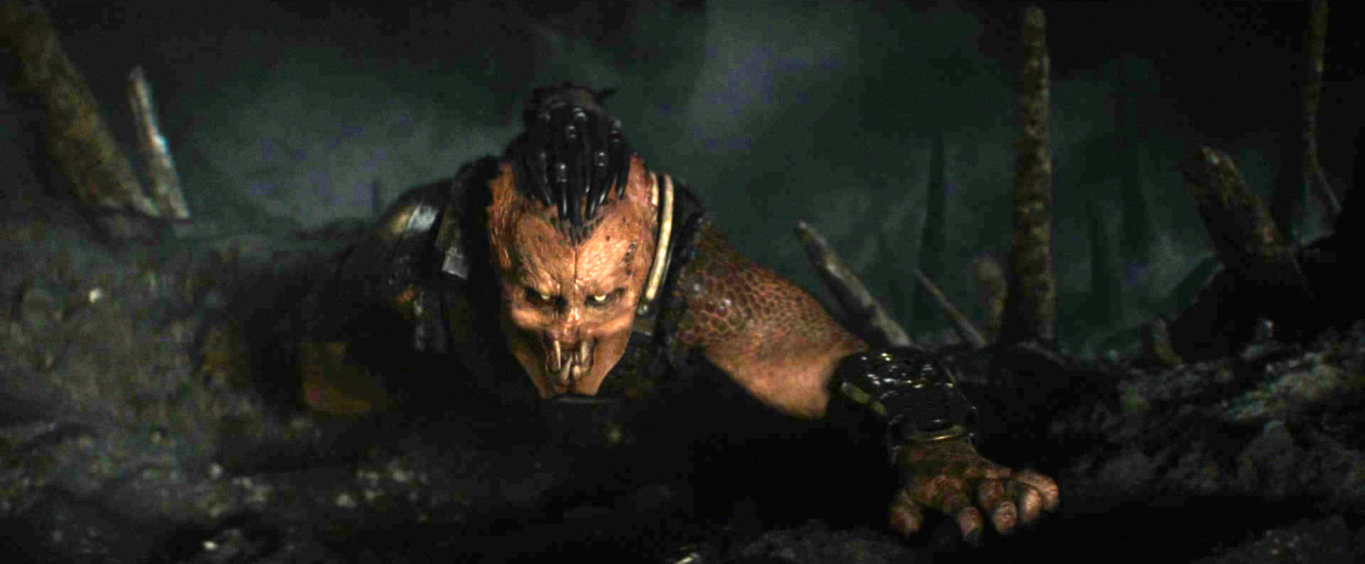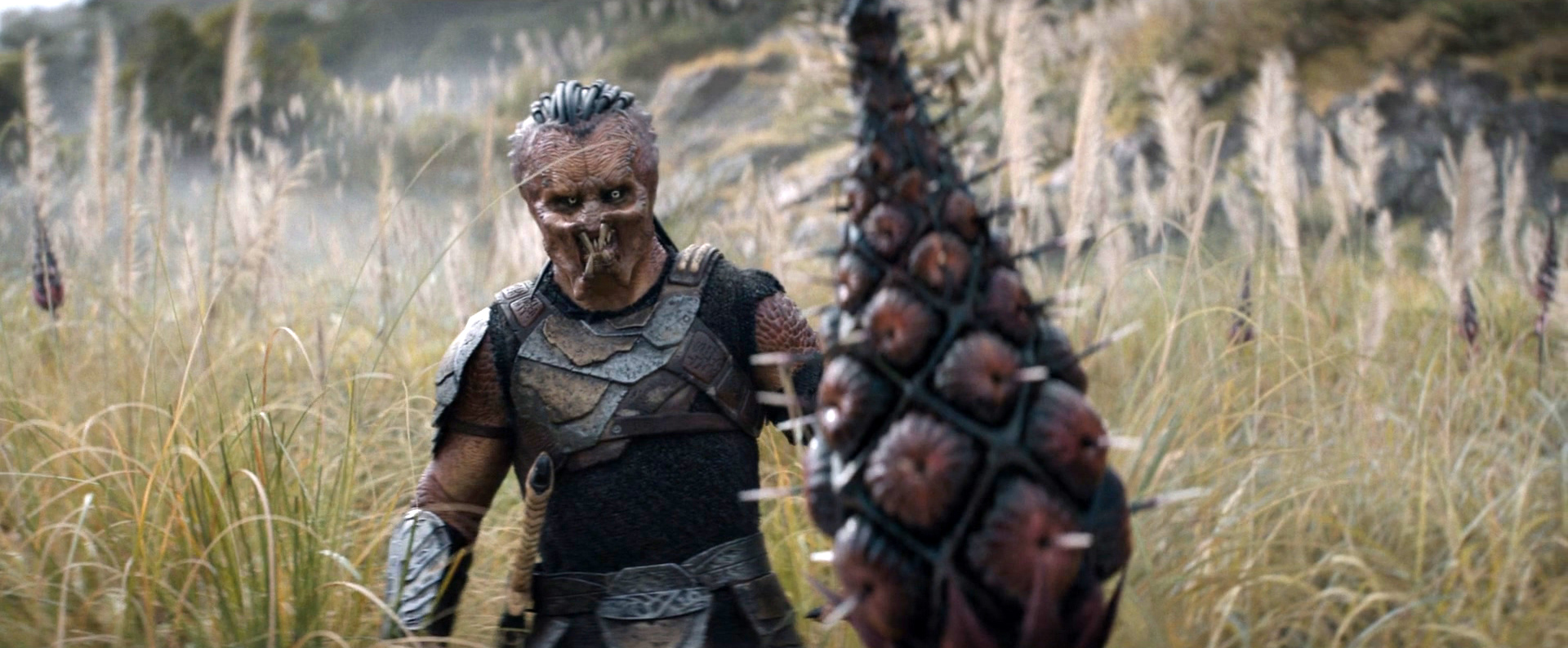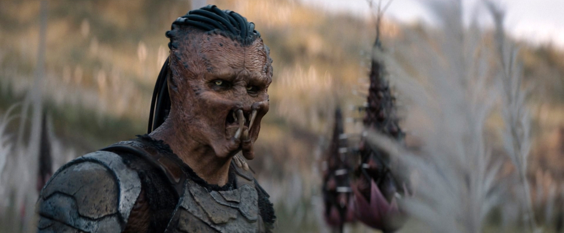 Что тут еще интересно? Ну, кроме впечатляющего фантастического антуража здесь классно сделано то, что Дэк говорит на своем языке, на яутжанском (примасский диалект). Съемочная группа долго думала над тем, каким вообще должен быть этот язык, и в итоге они обратились к Полу Фроммеру, создавшему язык на'ви для "Аватара", и тот к ним привел языковеда-филолога Бриттона Уоткинса, который и разработал язык для клана яутжа.