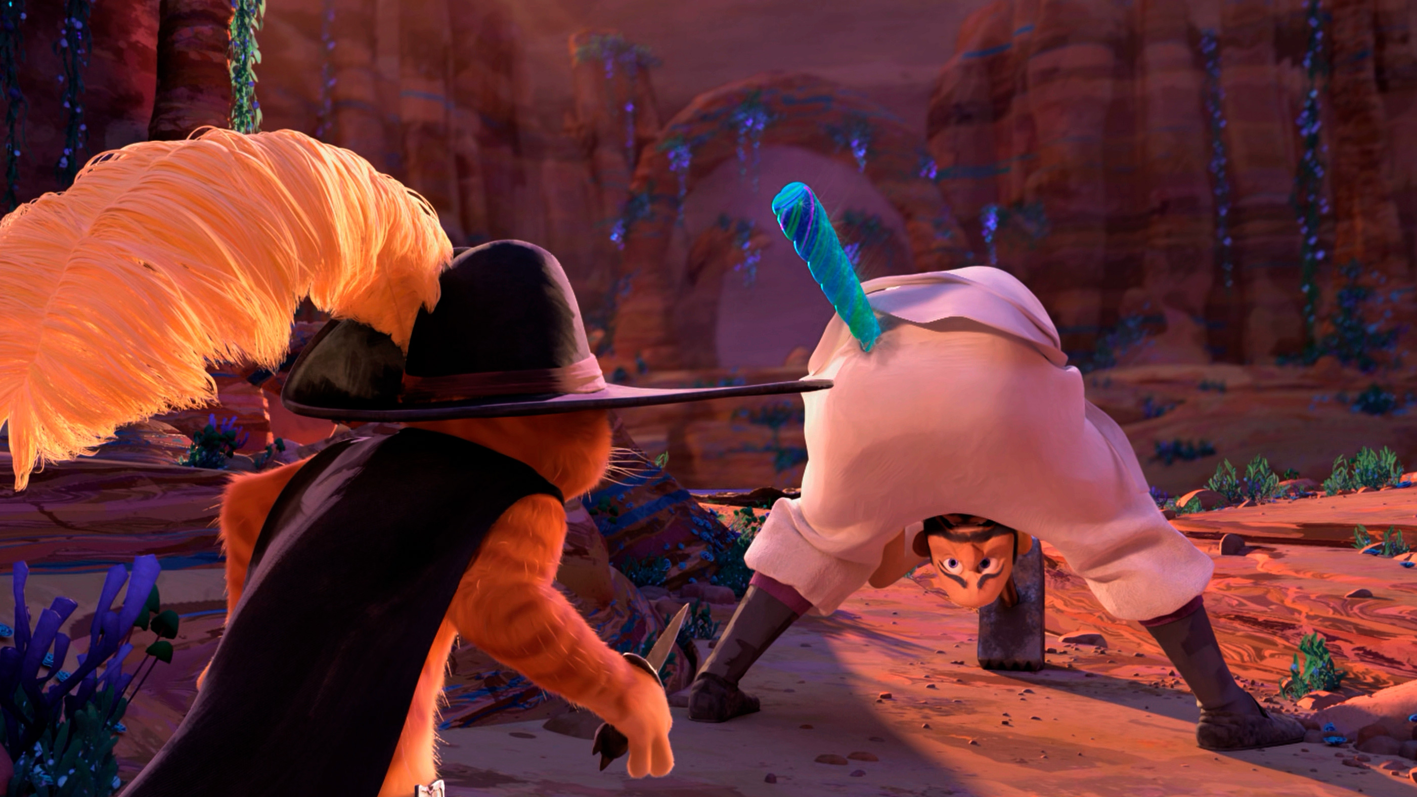 Сам Кот в сапогах сильно изменился. Он только в начале картины такой же залихватский рубака, как и раньше, но довольно быстро он понял, что старые времена прошли, что смерть в образе наводящего на него ужас волка в капюшоне преследует его по пятам, ну и поначалу он просто уходит в эдакие пенсионеры, а потом получает шанс все вернуть, для чего ему нужно, с одной стороны, вспомнить прежние навыки и прежний кураж, но, с другой стороны, он уже совсем не тот, что был раньше. И это заметно более интересный и глубокий персонаж, чем Кот из предыдущего фильма.