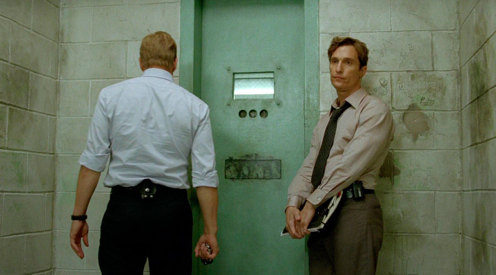 И вот эта внутренняя борьба, эти демоны, это наполовину потустороннее существование - МакКонахи все это изобразил совершенно потрясающе. У него даже характерные жесты этого Расти - яркие, обращающие на себя внимание.