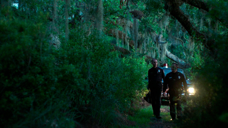 Шериф Джексон (Билл Келли) с напарником обследуют место происшествия. Труп лежит под здоровенной вышкой, на самой верхней площадке которой в полу открыто одно звено: очевидно, что Чейз или выпал оттуда, или его столкнули.