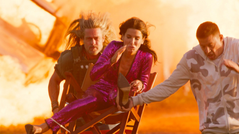 Откуда тут вообще взялся Брэд Питт - известно: они с Сандрой вместе снялись в фильме "Быстрее пули" (это в России так обозвали Bullet Train), который в июле выйдет на экраны, и она его уговорила появиться в "Затерянном городе". Причем это даже не совсем камео, а более или менее полноценная, хотя и совершенно эпизодическая роль, и Питт её сыграл отлично!
