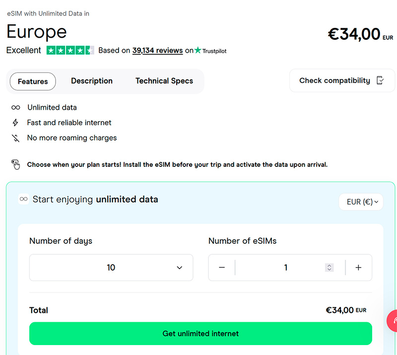 Например, по всей Европе в течение 30 дней - 10 ГБ за €13,51, то есть всего €1,35 за гиг, что реально дешево.