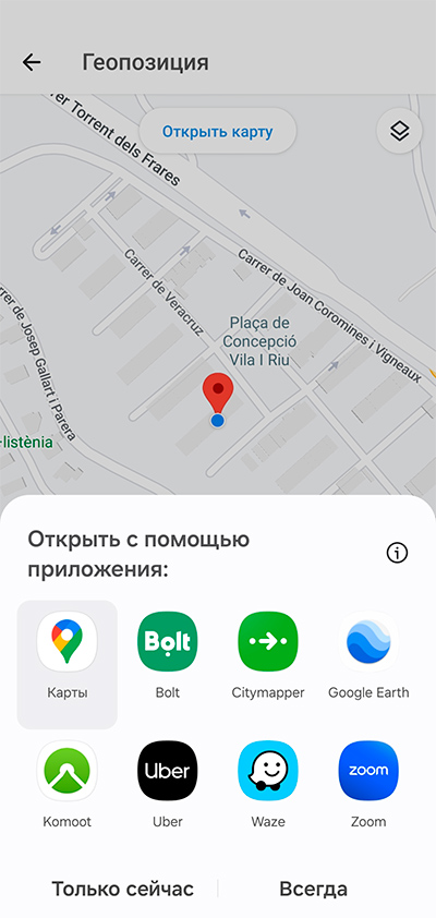 Там можно выбрать "Открыть карту" - и вам предложат открыть геопозицию в выбранном приложении.