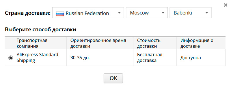 Почти всегда доступна бесплатная доставка AliExpress Standard Shipping. У многих пользователей возникает вопрос, каким образом они ухитряются что-то зарабатывать, бесплатно доставляя из Китая в Россию какой-нибудь проводочек за полтора доллара, но пусть вас это не волнует: вы можете заказывать хоть совершенно копеечные безделуши, а доставка - это их проблема. Главное - следить, чтобы она была бесплатная.
