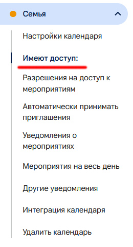 После этого заходите в настройки созданного календаря и выбираете там пункт "Имеют доступ".