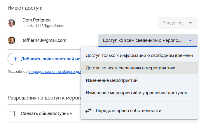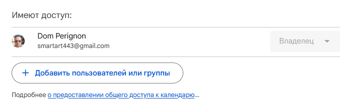 И там добавляете аккаунты тех пользователей, которые должны иметь доступ к этому календарю.