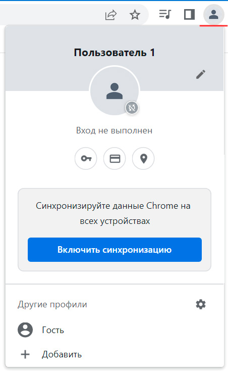 Chrome умеет синхронизировать данные аккаунта для различных устройств, и это очень удобно. Чтобы войти в свой аккаунт, нужно нажать на пиктограмму, расположенную справа от адресной строки.